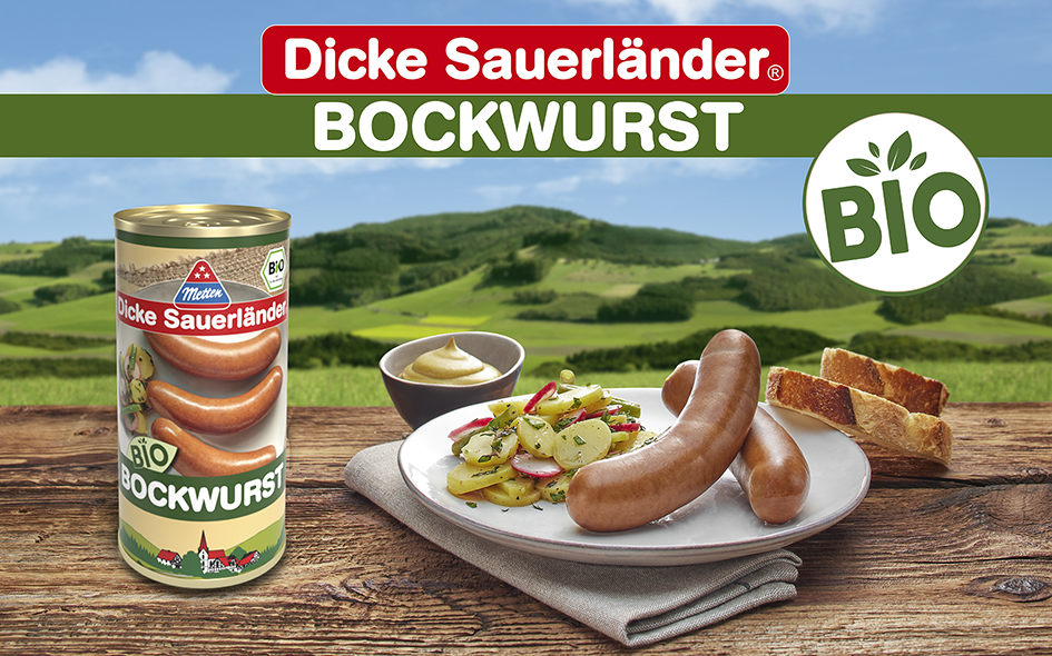 "Dicke Sauerländer" gibt es auch in Bio! Wir haben das Sortiment mit der "Dicke Sauerländer" Bio Bockwurst erweitert, die den typischen Knack und den unerreichten Geschmack mit dem steigenden Bedürfnis nach nachhaltigem Genuss vereinen.